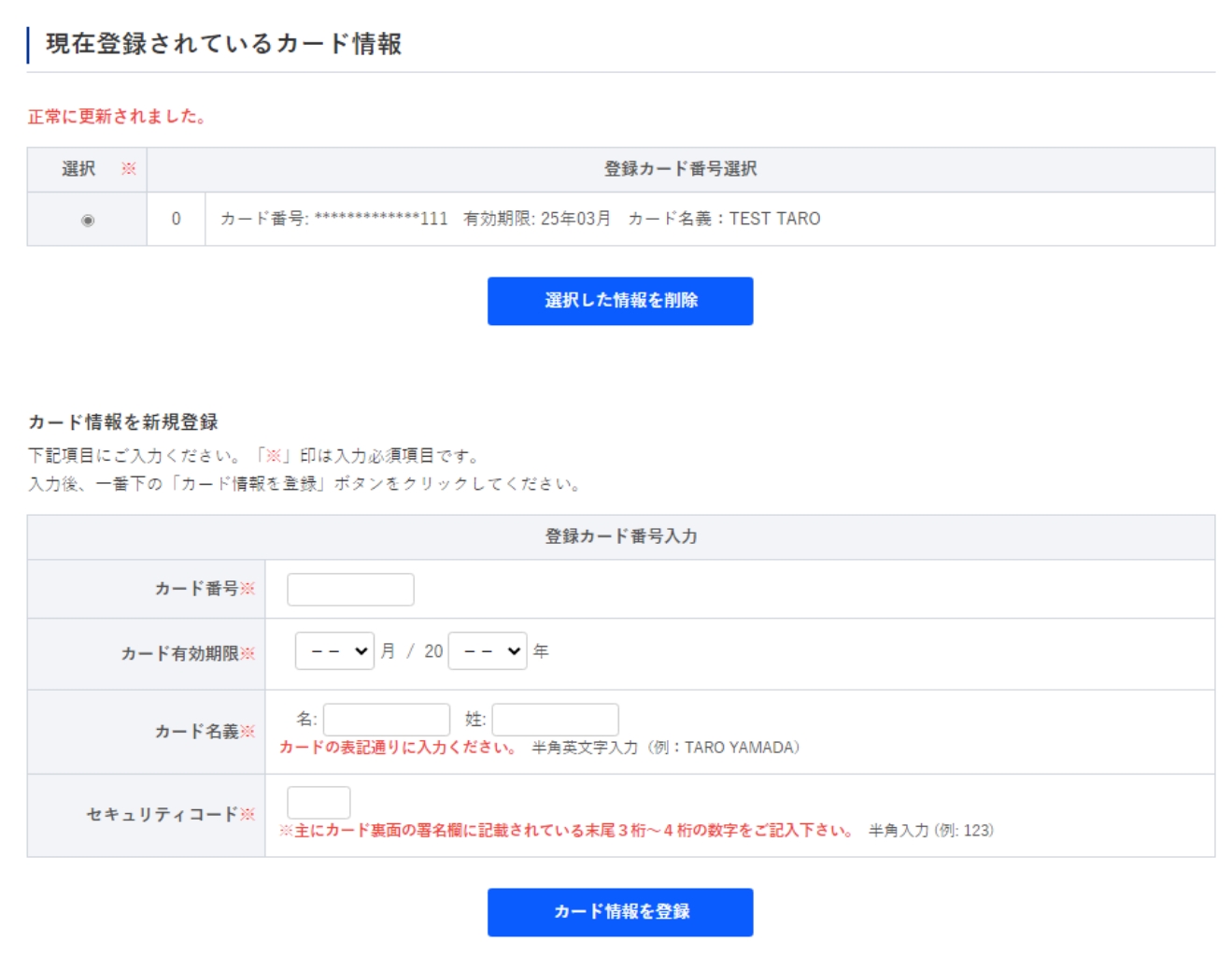 正常に更新されると、登録カード番号の選択肢から削除されます。